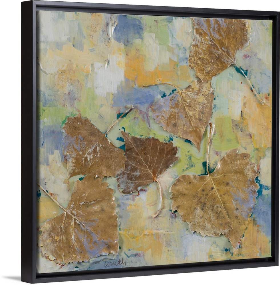 <p>Contemporary painting with several brown leaves surrounded by abstract color.</p>
