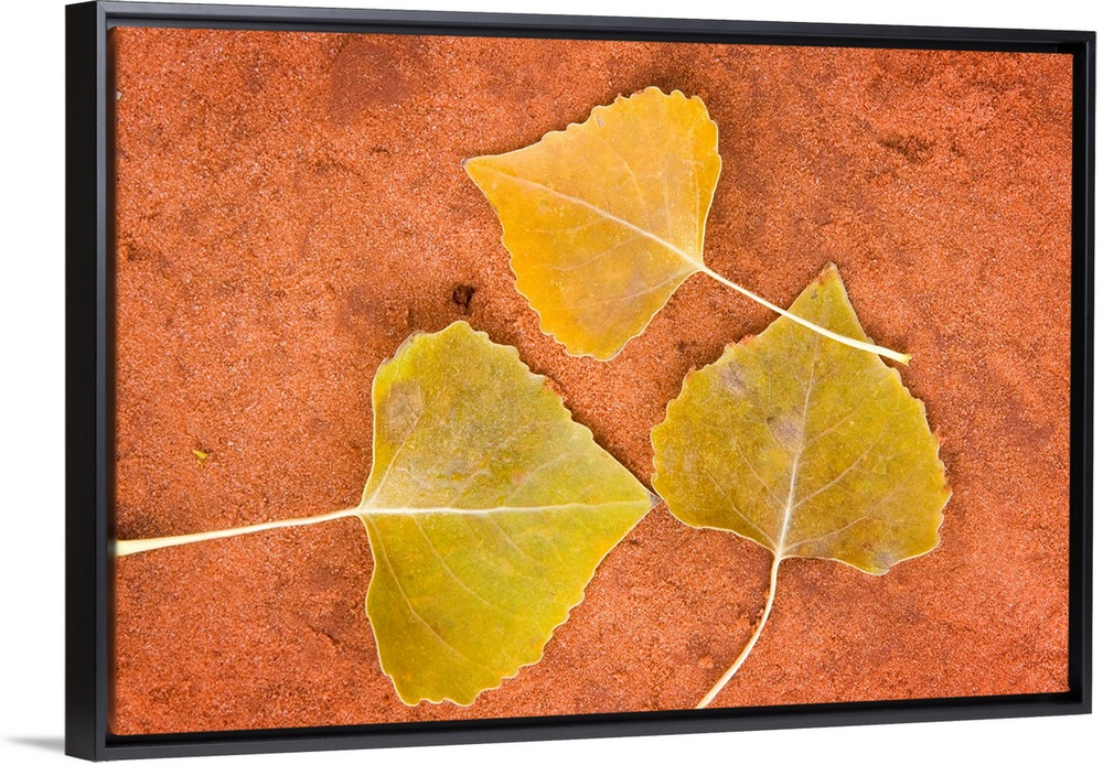 <p>Cottonwood leaves on pink sand, Zion National park Utah USA</p>