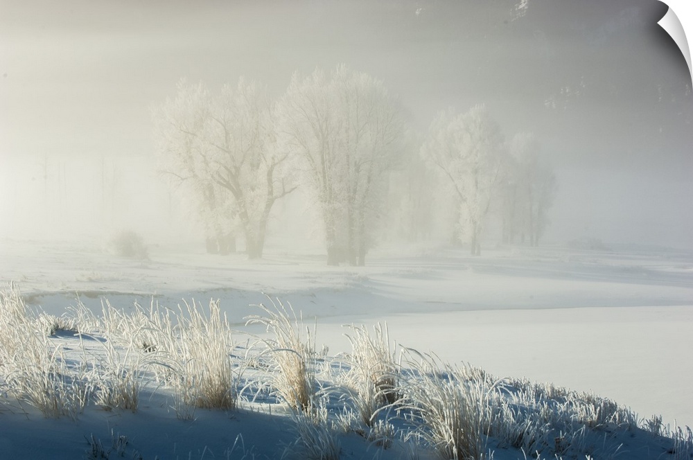 <p>Cottonwood trees (Populus deltoides) clustered in a field, seen through the fog on a sunlit snowy landscape in the Lamar Valley Yellowstone National Park, United States of America</p>