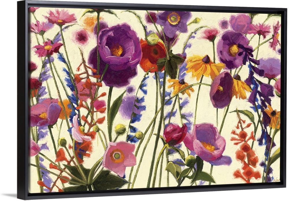 <p>Contemporary painting of several types of flowers springing up from the bottom of the print.</p>