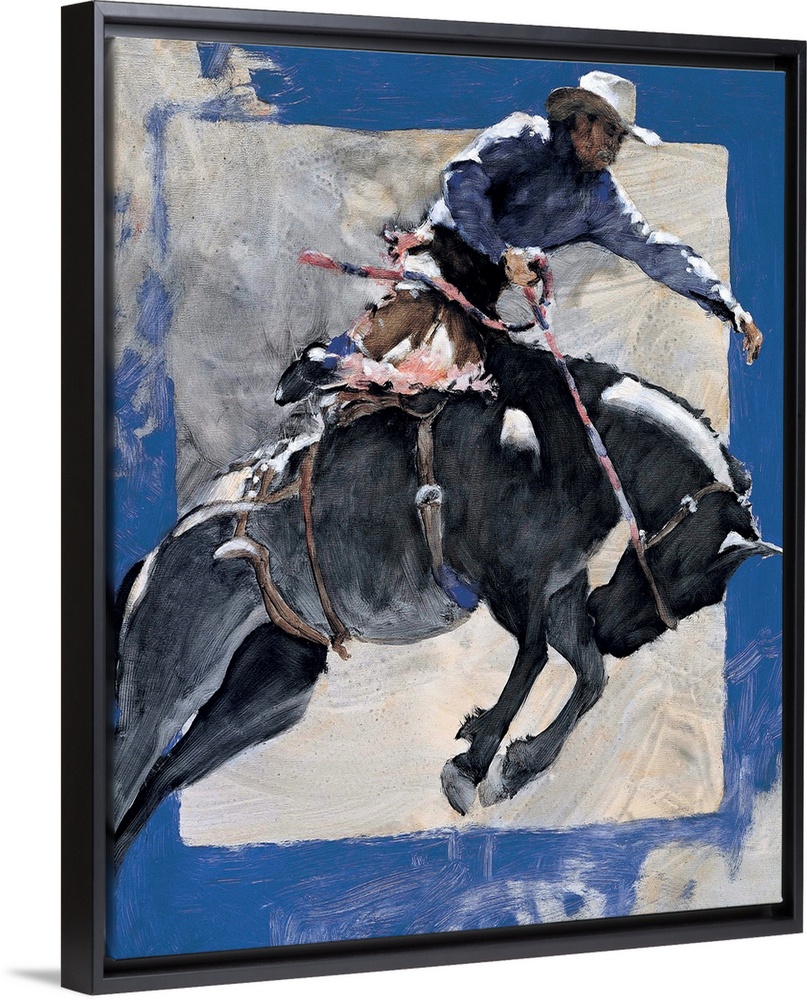 <p>Western themed contemporary painting of a cowboy riding a bucking bronco.</p>