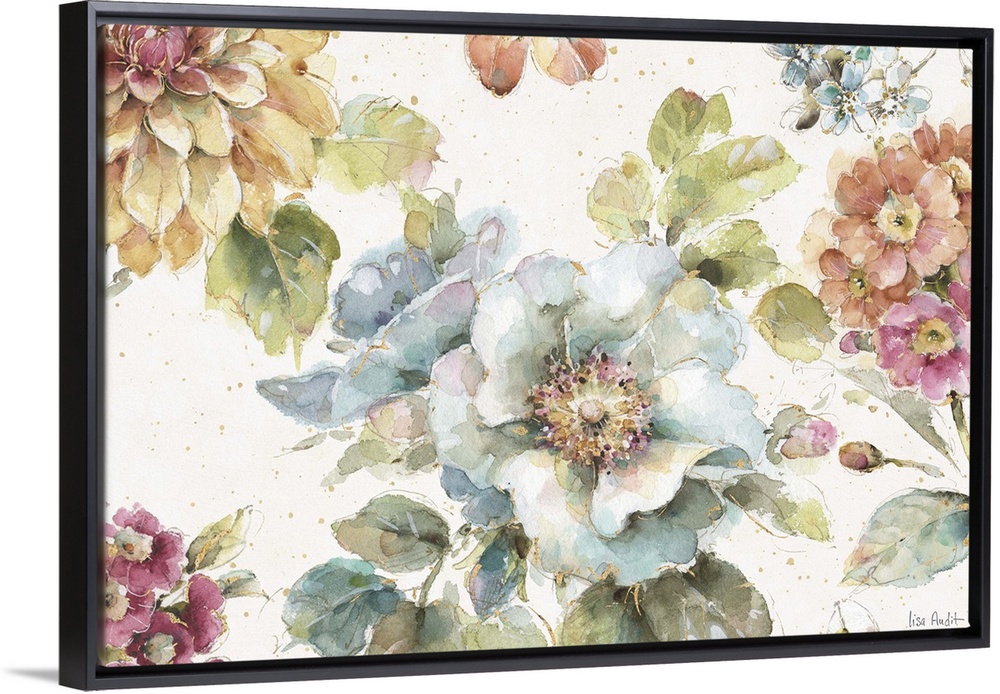 <p>Floral watercolor painting on a white background with gold paint splatter.</p>