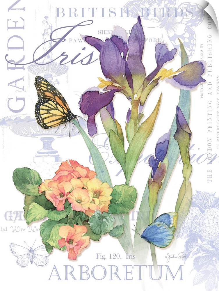 <p>Watercolor painted purple irises and pink hydrangeas with two butterflies on top of a white background with light purple illustrations and text.</p>
