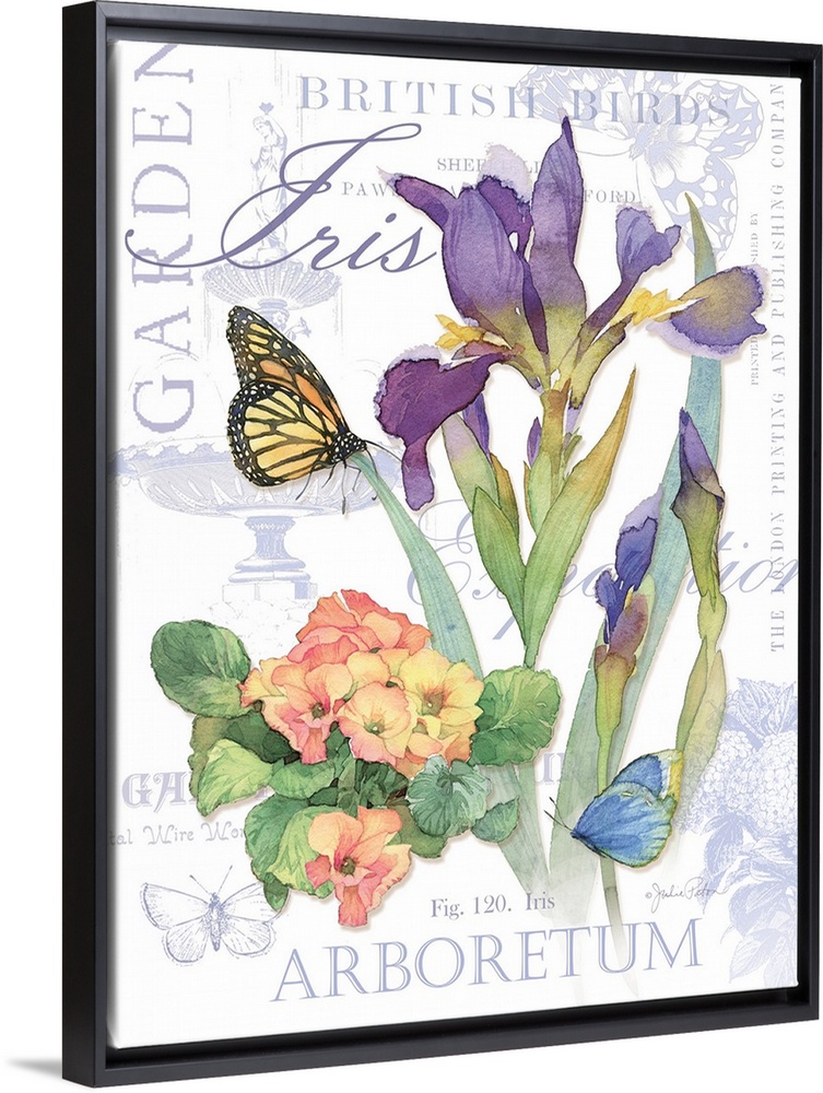 <p>Watercolor painted purple irises and pink hydrangeas with two butterflies on top of a white background with light purple illustrations and text.</p>