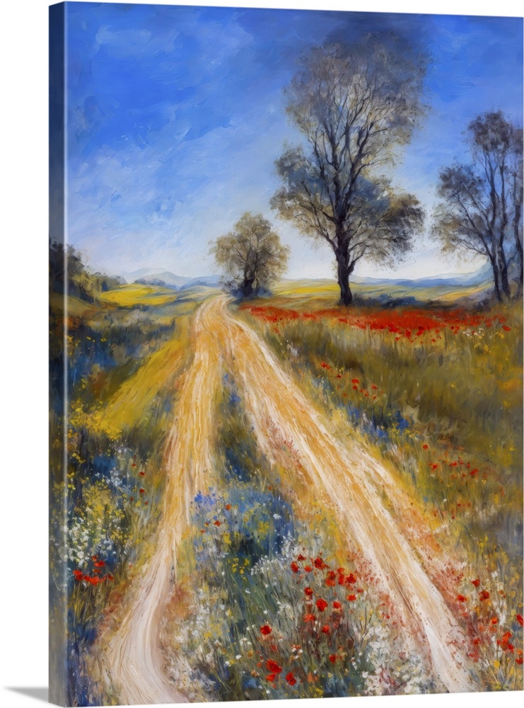 <p>Winding country path extending through a lush landscape filled with red poppies and green trees.</p>