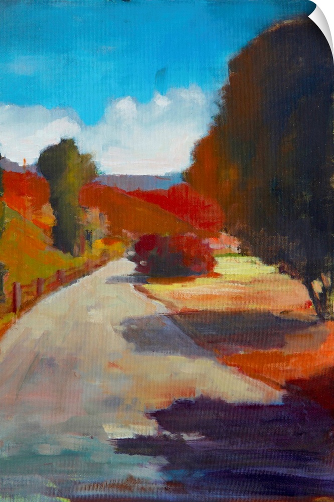 <p>Landscape painting of a country road surrounded by grass and trees in Autumn colors.</p>