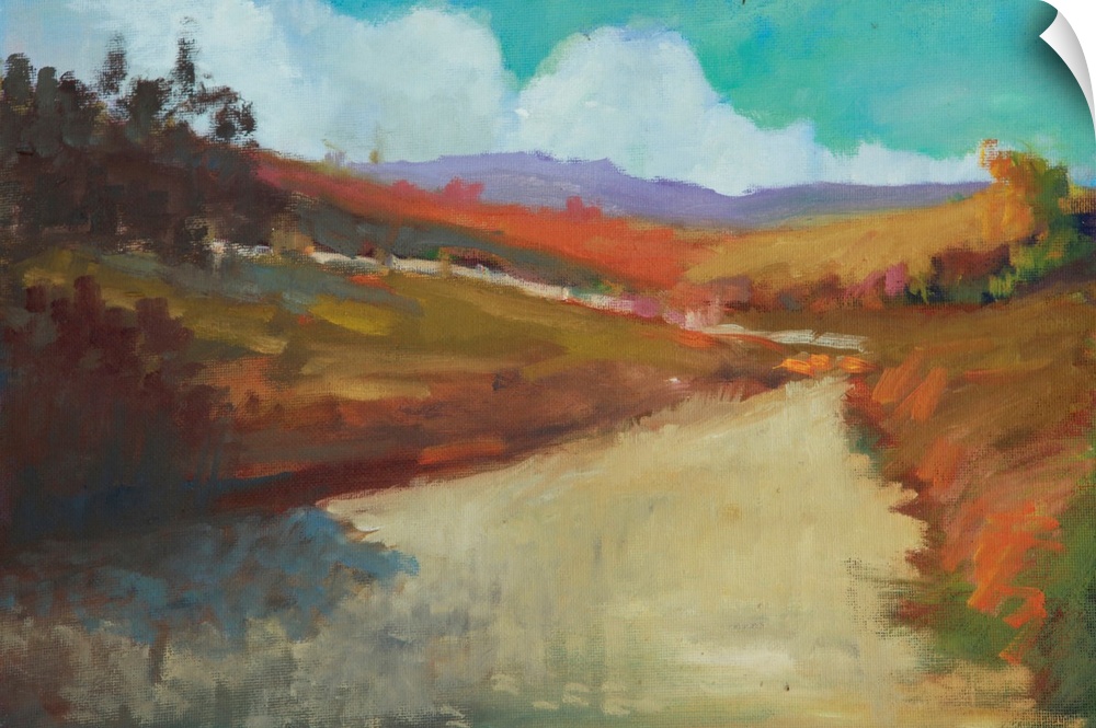 <p>Contemporary landscape painting of a road leading through colorful hills and trees.</p>