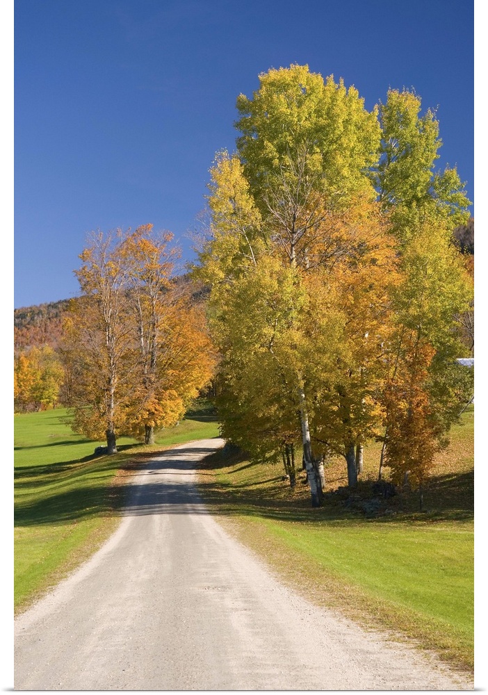<p>Country road with pastures and Maples trees in autumn. Vermont. USA</p>