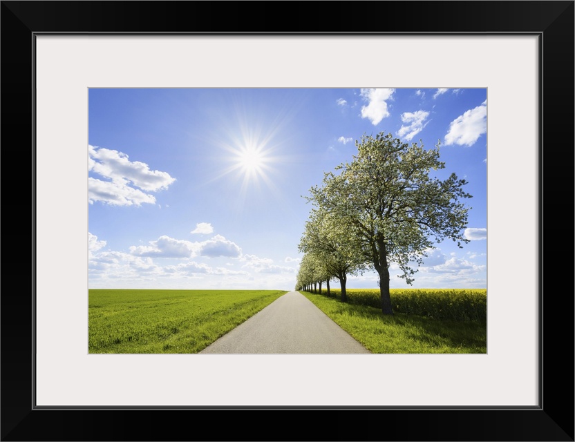 <p>Country Road with Row of Pear Trees and Sun in Spring, Spielbach, Baden-Wurttemberg, Germany</p>