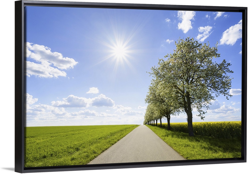 <p>Country Road with Row of Pear Trees and Sun in Spring, Spielbach, Baden-Wurttemberg, Germany</p>