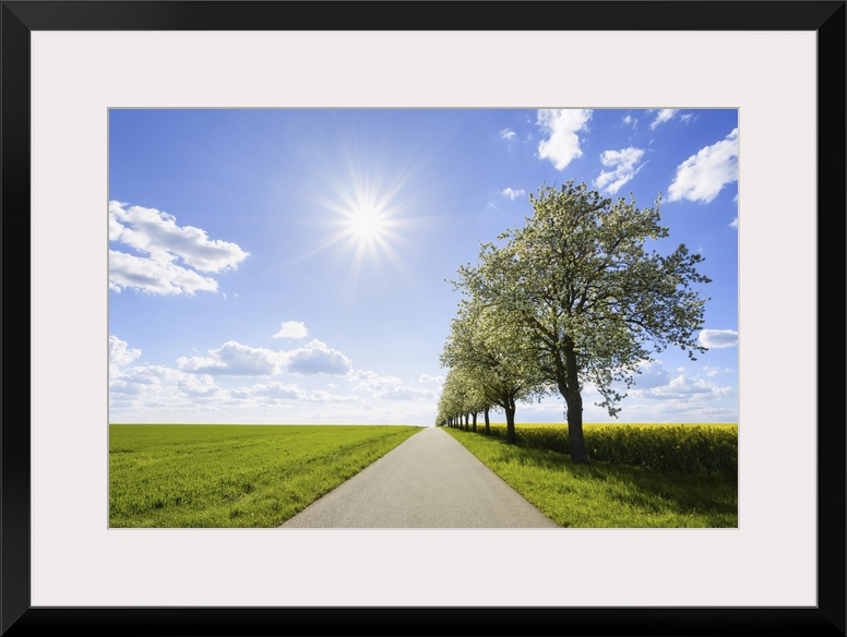 <p>Country Road with Row of Pear Trees and Sun in Spring, Spielbach, Baden-Wurttemberg, Germany</p>