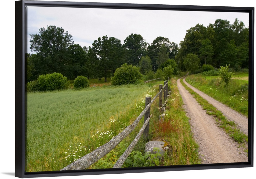 <p>Country road, wooden fence and field. Through the forest. Smaland region. Sweden, Europe.</p>