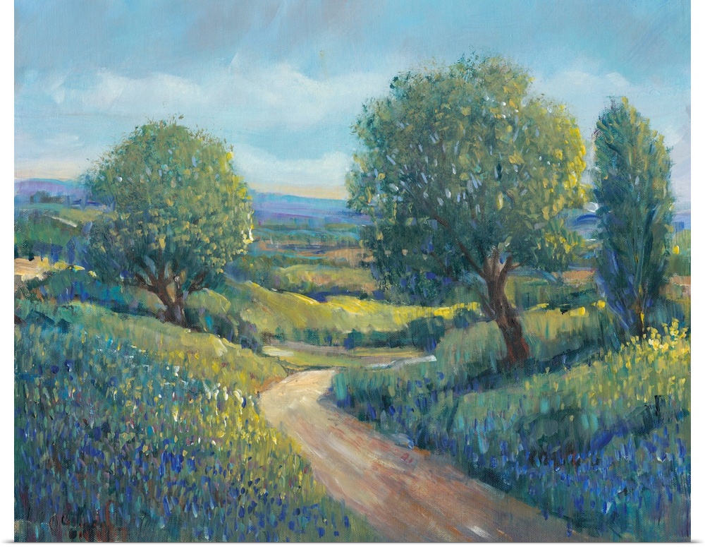 <p>Contemporary landscape painting of trees along a dirt path in the countryside.</p>