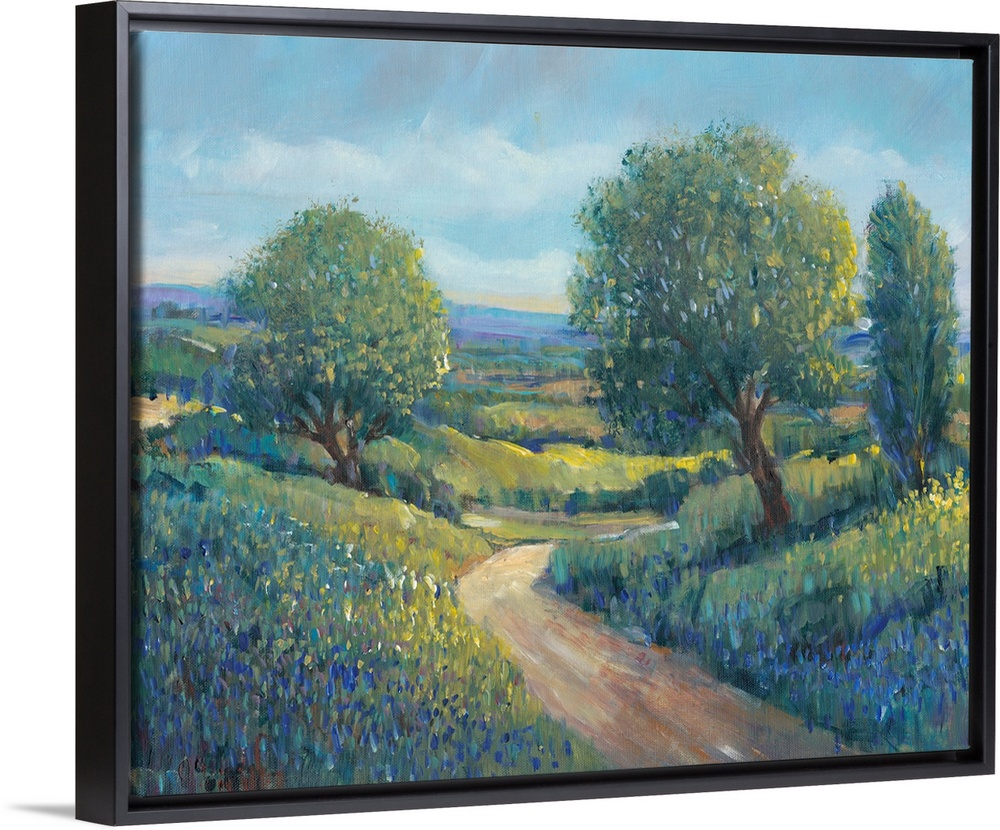<p>Contemporary landscape painting of trees along a dirt path in the countryside.</p>