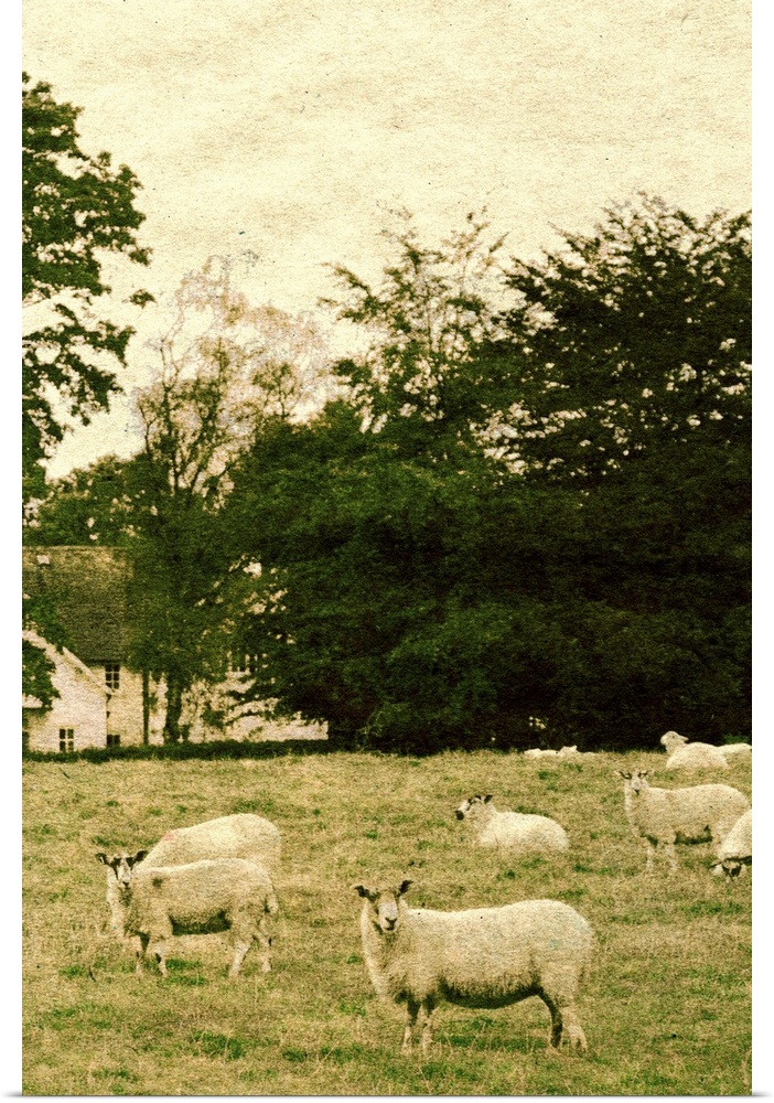 <p>Countryside scene with sheep in a field with a large house hidden amongst trees</p>