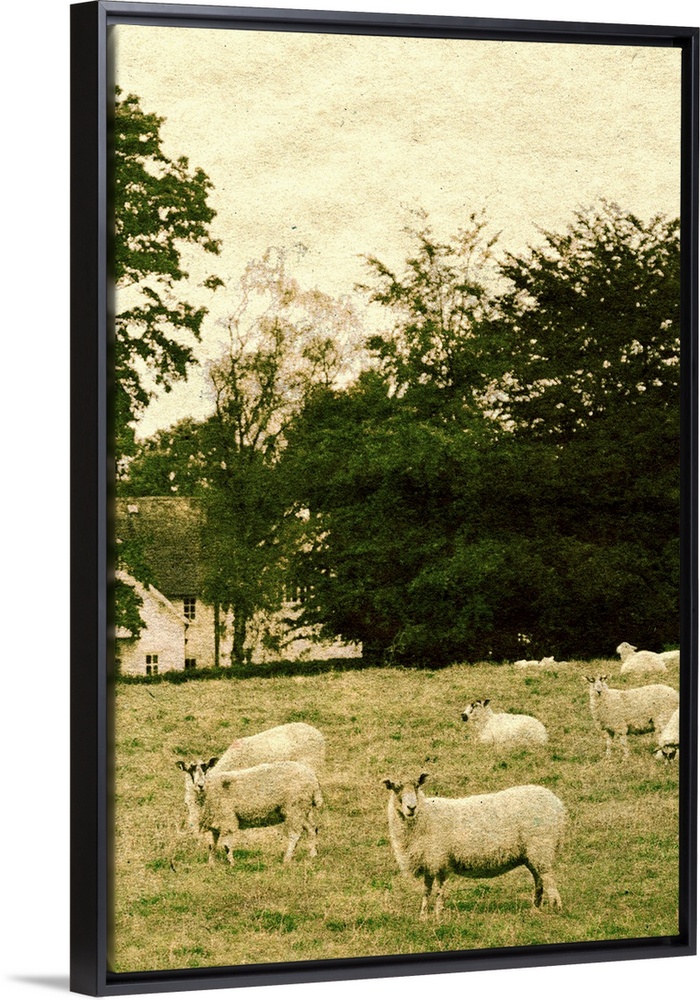 <p>Countryside scene with sheep in a field with a large house hidden amongst trees</p>