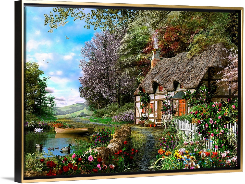 <p>Traditional painting of county home by lake. The chimney is smoking and the home is surrounded by trees and colorful flowers. The lake has a small canoe and swan in it.</p>
