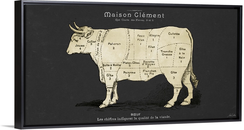 <p>Contemporary illustration of a cow with dotted lines marked on the body sectioning the different cuts of meat.</p>