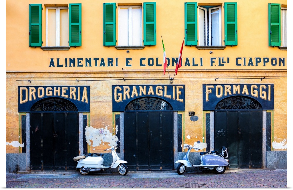 <p>Couple of Lambretta Innocenti scooter parked at the old grocery, Morbegno, province of Sondrio, Valtellina, Lombardy, Italy.</p>