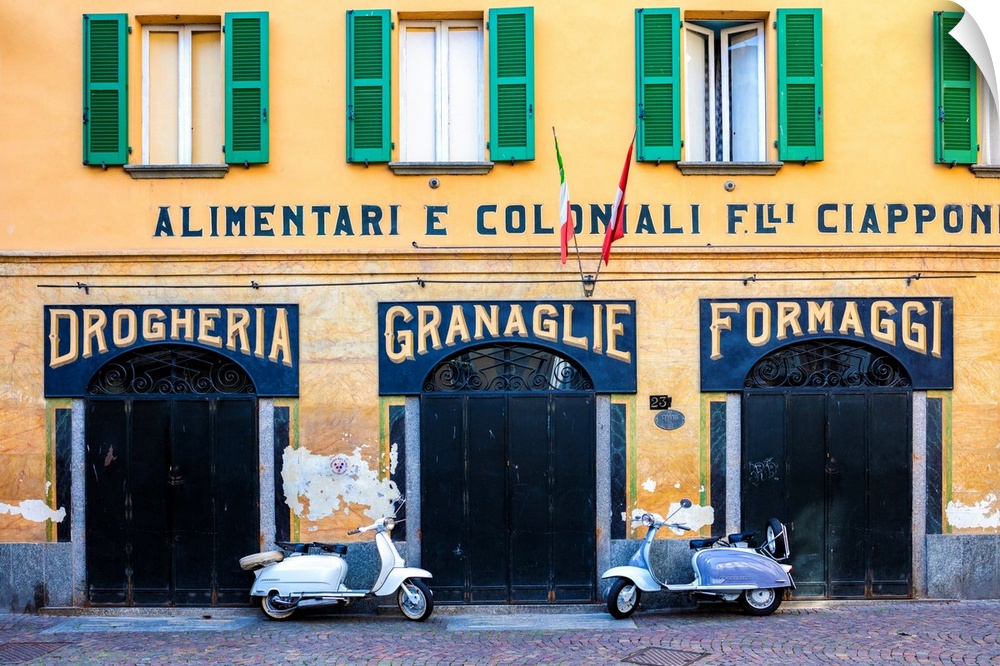 <p>Couple of Lambretta Innocenti scooter parked at the old grocery, Morbegno, province of Sondrio, Valtellina, Lombardy, Italy.</p>