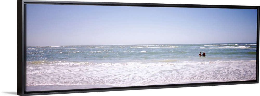 <p>Panoramic image on canvas of the ocean with two people standing in it.</p>