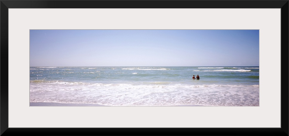 <p>Panoramic image on canvas of the ocean with two people standing in it.</p>