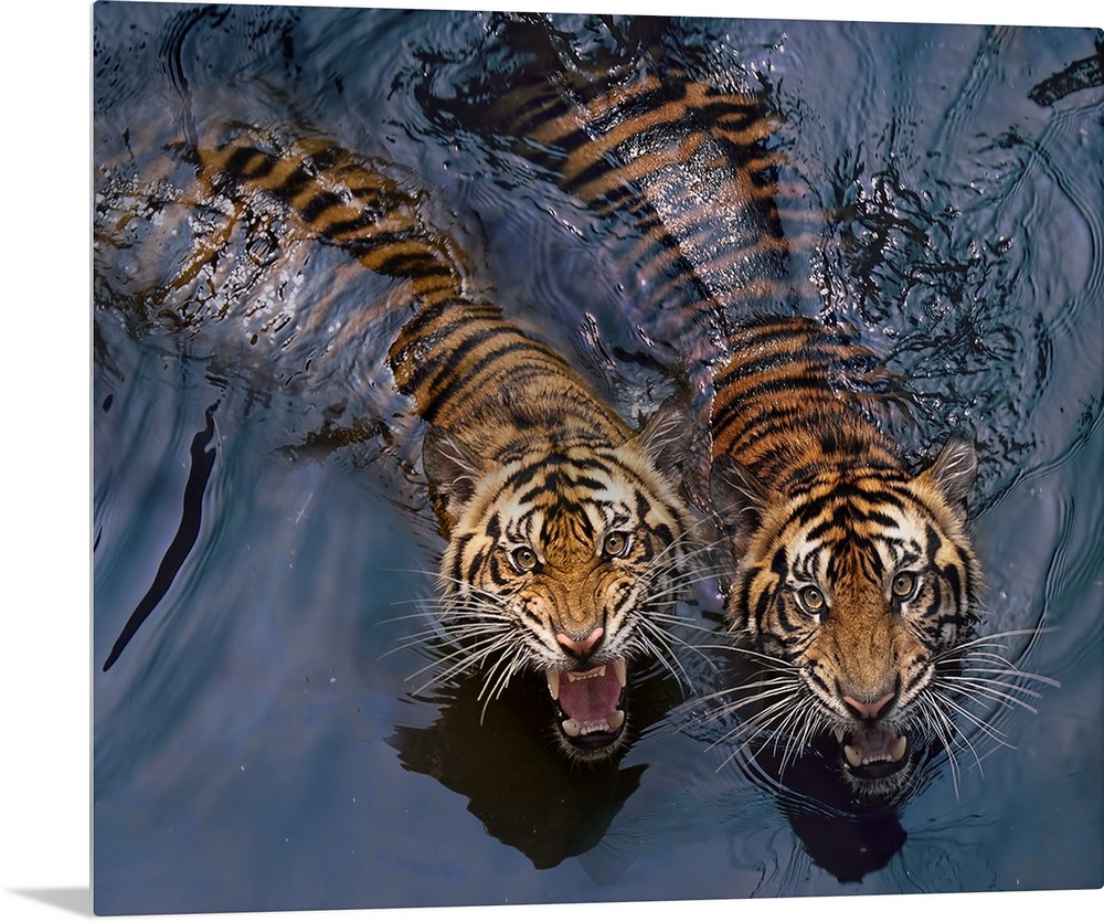 <p>Two snarling tigers swimming in water.</p>