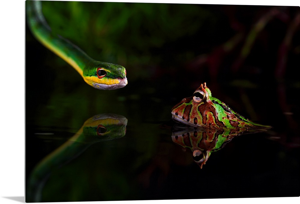 <p>Green snake staring at a spotted frog sitting in shallow water.</p>