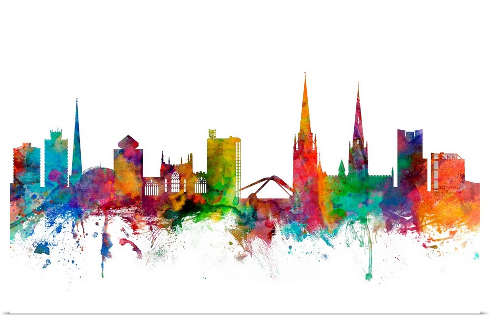 <p>Contemporary piece of artwork of the Coventry, England skyline made of colorful paint splashes.</p>