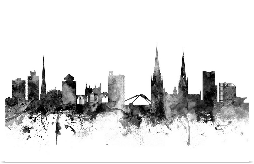 <p>Contemporary artwork of the Coventry city skyline in black watercolor paint splashes.</p>