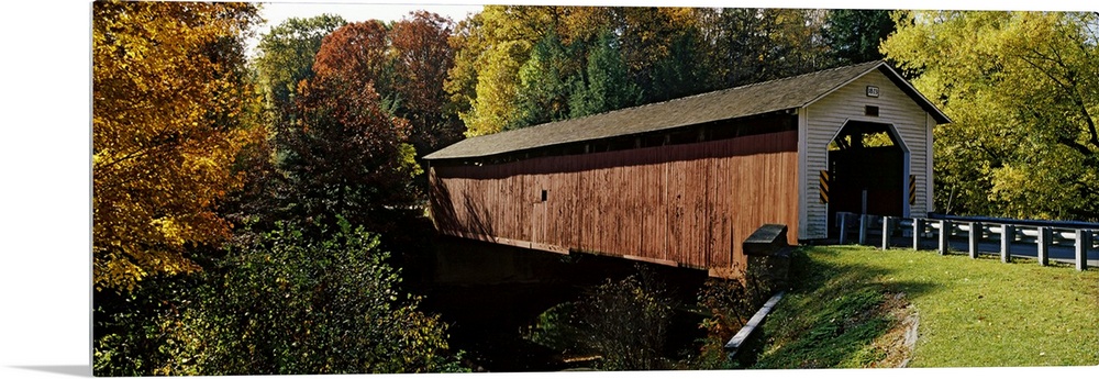 <p>Panoramic photograph of the wooden McGees Mill covered bridge, surrounded by a forest of trees with fall foliage, in Clearfield County, Pennsylvania.</p>