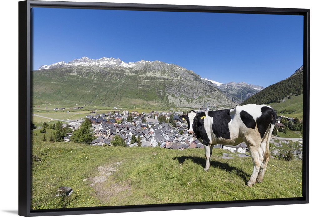<p>Cow grazing in the green pastures surrounding the alpine village of Andermatt, Canton of Uri, Switzerland, Europe</p>