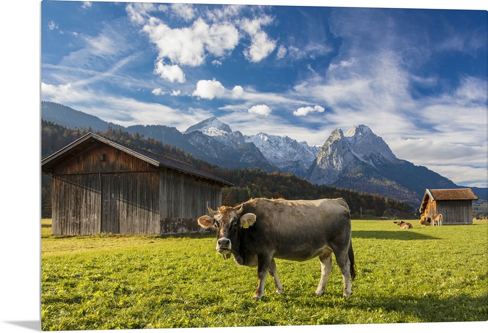 <p>Cow in the green pastures framed by the high peaks of the Alps, Garmisch Partenkirchen, Upper Bavaria, Germany</p>