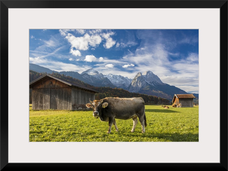 <p>Cow in the green pastures framed by the high peaks of the Alps, Garmisch Partenkirchen, Upper Bavaria, Germany</p>