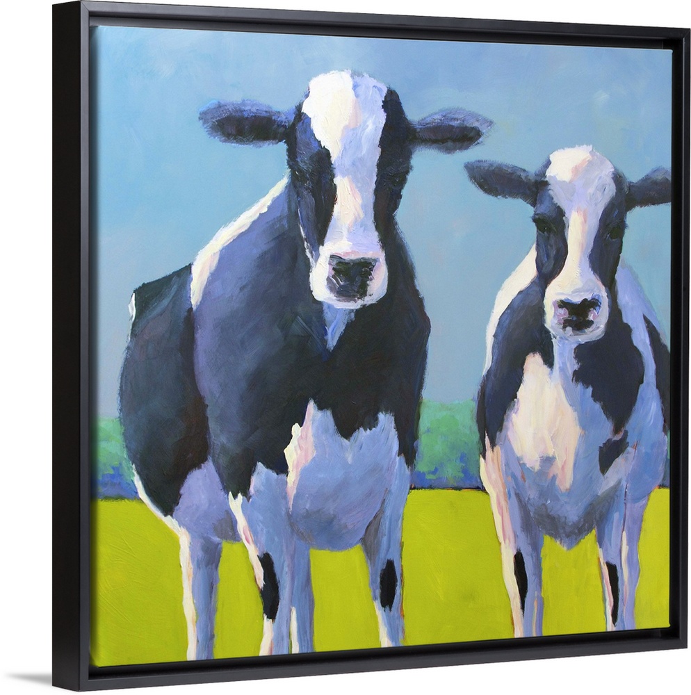 <p>Contemporary painting of two black and white dairy cows in a green field.</p>