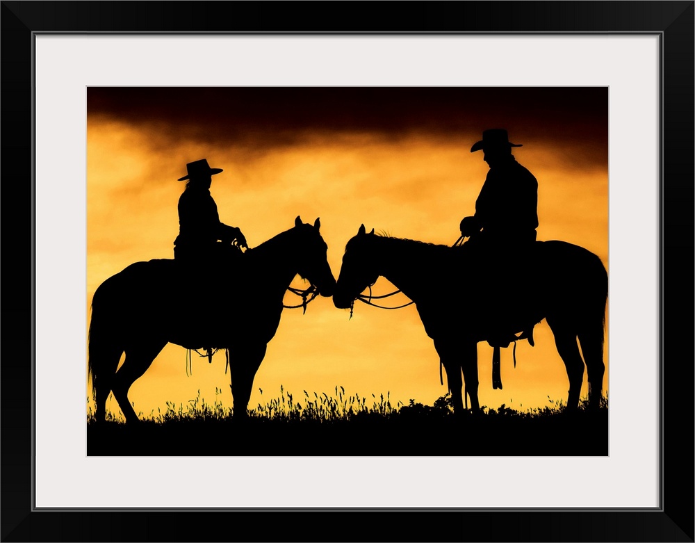 <p>Giant photograph showcases the shadowed profiles of a man and woman sitting on a couple horses within a field as the sun begins to set.</p>