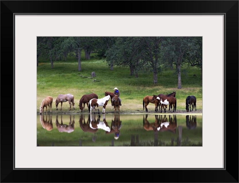 <p>Horizontal photograph on large canvas of a cowboy sitting on a horse, surrounded by a group of horses at a lakes edge, a forest full of trees behind them, near Yosemite, California.</p>