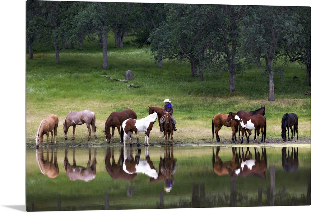<p>Horizontal photograph on large canvas of a cowboy sitting on a horse, surrounded by a group of horses at a lakes edge, a forest full of trees behind them, near Yosemite, California.</p>