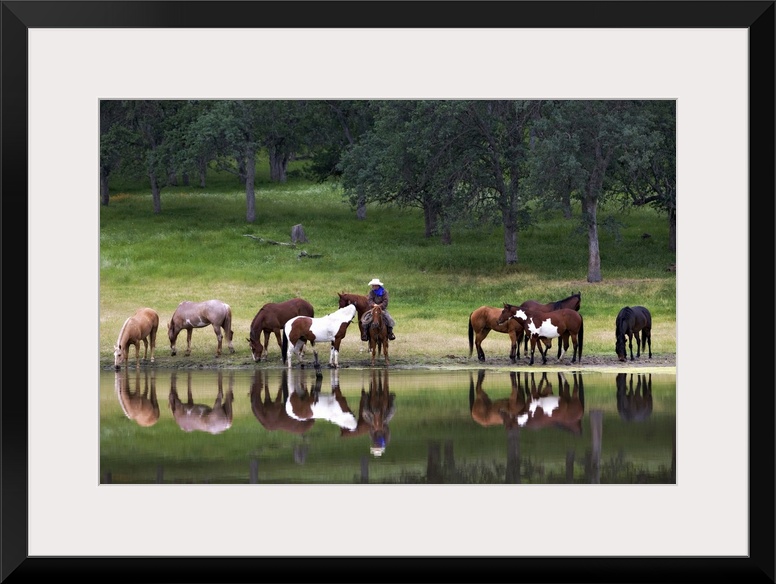 <p>Horizontal photograph on large canvas of a cowboy sitting on a horse, surrounded by a group of horses at a lakes edge, a forest full of trees behind them, near Yosemite, California.</p>