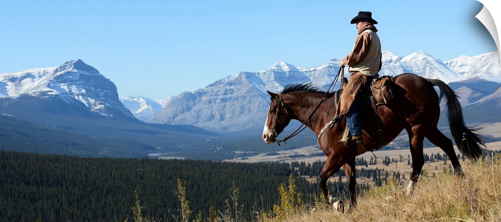 <p>Cowboy riding with a view of the Rocky mountains, Ya-Ha-Tinda Ranch, Clearwater County, Alberta, Canada.</p>