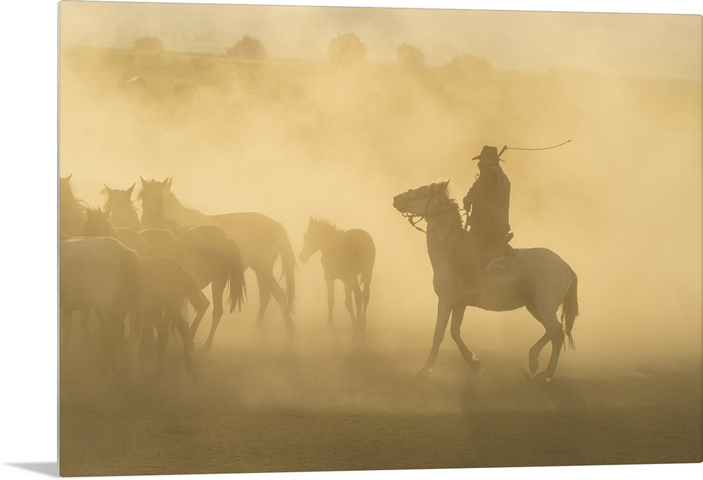 <p>Cowboy on horse with whip herding wild and semi-wild Yilki horses at sunset, Hacilar, Kayseri, Cappadocia, Anatolia, Turkey, Asia Minor, Asia</p>