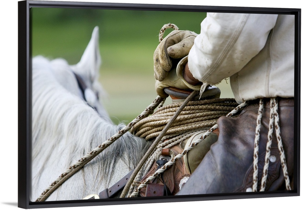 <p>Landscape, close up photograph of the arm, waist and leg of a cowboy riding a horse, with gloves on, while holding onto the reins. The back of the horses head can be seen, against a background of blurred green landscape.</p>