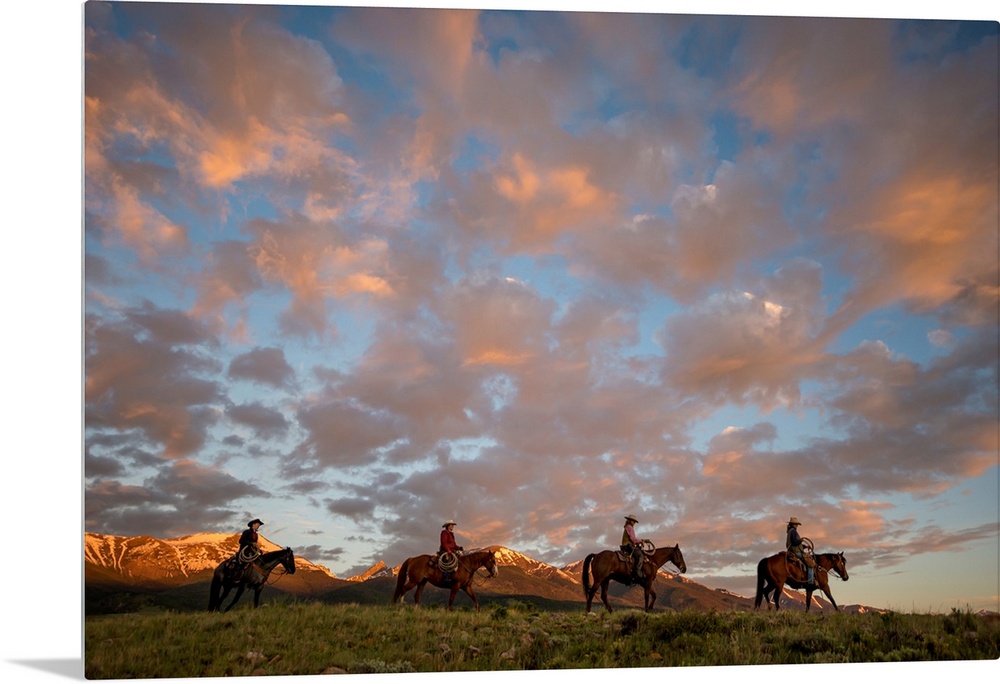 <p>Sunset photograph with four people on horseback riding through a valley in a line with snow capped mountains in the background.</p>