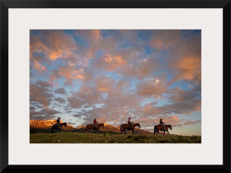 <p>Sunset photograph with four people on horseback riding through a valley in a line with snow capped mountains in the background.</p>