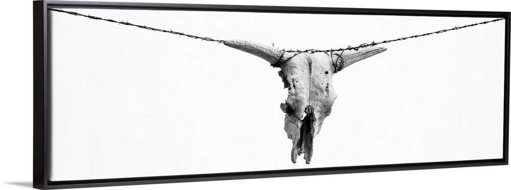 <p>Embrace the beauty and simplicity of the American West with this stunning fine-art black-and-white photograph of a cow skull hung with barbed wire over the entrance to a South Dakota ranch. This powerful image captures the essence of the rugged frontier and the hardworking spirit of the American cowboy. The panoramic format showcases the stark beauty of the cow skull and the barbed wire against the skies over the ranch to tell the story of the American West and its enduring spirit.</p>
