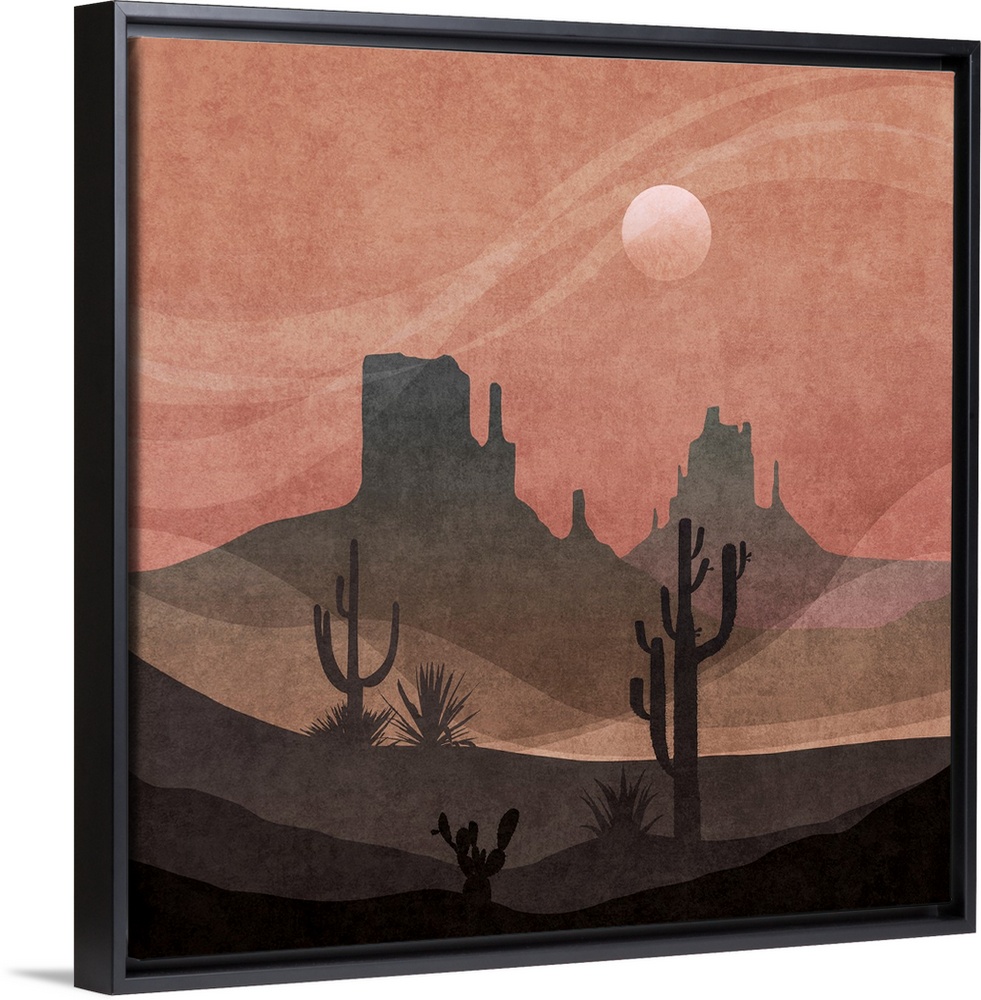 <p>A stylized graphic desert scene in layers of greys and dark rose pink - a contemporary illustration in warm shades.</p>