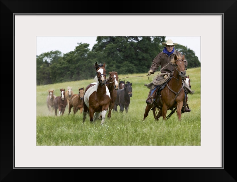 <p>Cowboy herding several horses across a field near Yosemite, CA.</p>