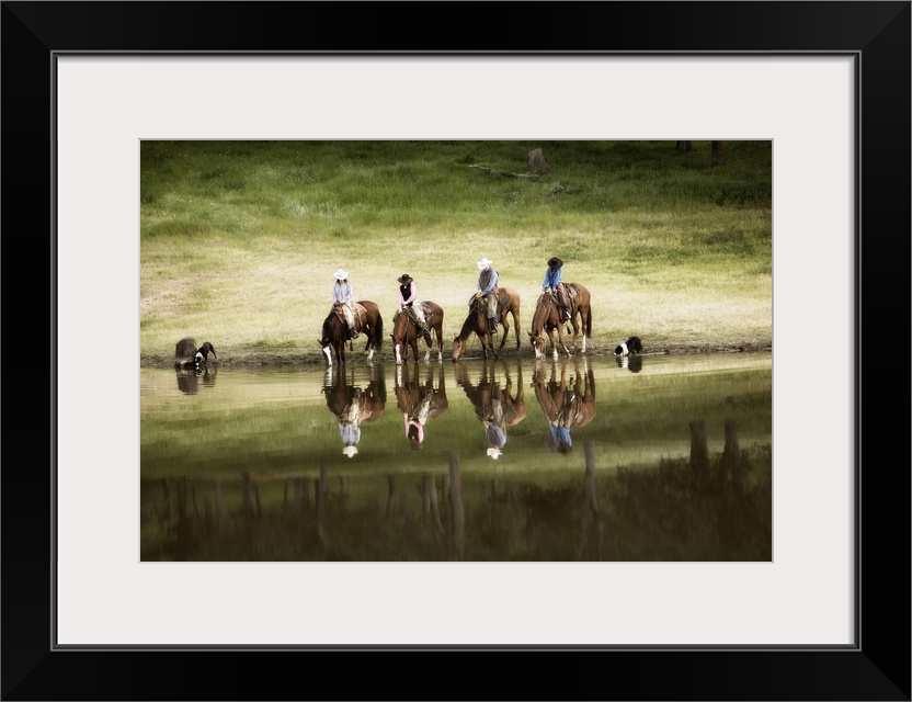 <p>Photograph of horseback riders and their dogs by water at dusk. The riders and horses and reflected in the water.</p>