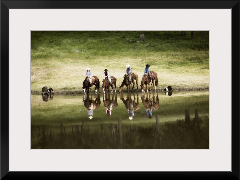 <p>Photograph of horseback riders and their dogs by water at dusk. The riders and horses and reflected in the water.</p>