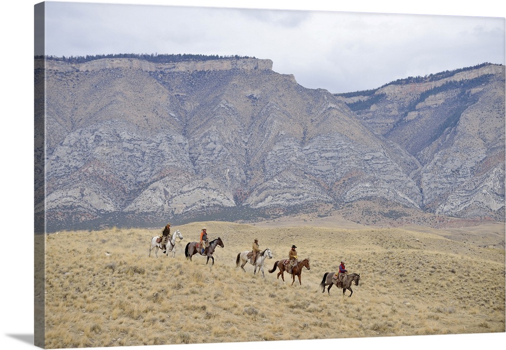 <p>Cowboys and Cowgirls riding horse in wilderness, Rocky Mountain, Wyoming</p>